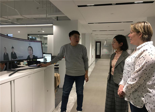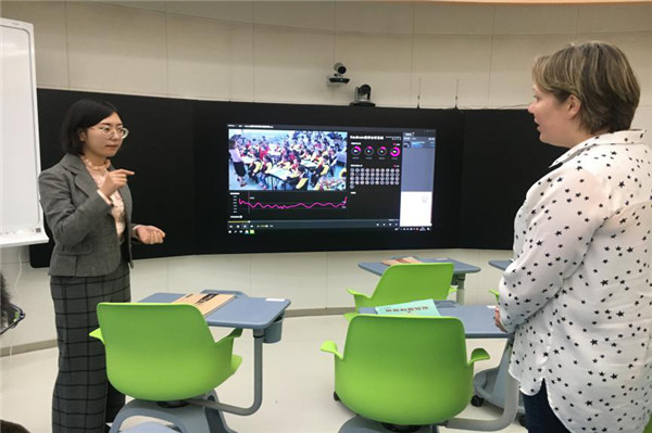 Caroline Wright女士一行還參觀了位於(yu) 5樓的專(zhuan) 注於(yu) 教育人工智能的清帆科技,親(qin) 身體(ti) 驗EduBrain全息課堂。EduBrain全息課堂可為(wei) 學校提供數據分析引擎、為(wei) 教師提供AI助手。通過體(ti) 驗,Caroline Wright女士問:“進行麵部識別的時候,如果每個(ge) 人的麵部表情不是那麽(me) 明顯,又會(hui) 怎樣呢?”工作人員立刻解答:“我們(men) 的係統可以識別不同層次的表情,比如不笑、微笑、大笑等,非常智能。”