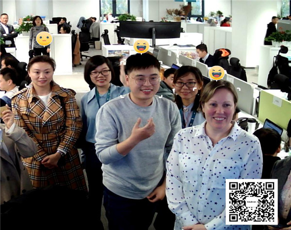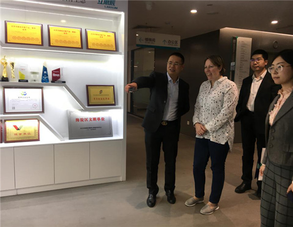 隨後,一行人來到辦公區進行參觀。時屬深秋,坐落於(yu) 中關(guan) 村軟件園的康邦科技,紅楓醉人,黃葉爛漫。Caroline Wright女士眺望窗外,不禁誇讚康邦優(you) 美的辦公環境。