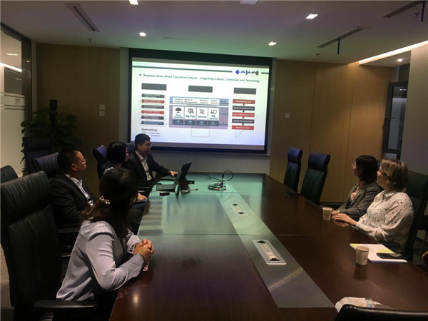隨後,教育軟件研究所所長楊坤、創新課程部經理劉玉婷向來賓介紹公司及智慧校園軟件開發、特色課程與(yu) 特色學校建設方案。介紹完畢,Caroline Wright女士詢問康邦現已服務過多少所學校?“我們(men) 是全國性的公司,如今已為(wei) 全國上千所學校提供過服務。比如說北京的高等院校、重點中學、重點小學,其中很多所學校都與(yu) 康邦有過合作。”技術中心總經理嚴(yan) 永芳說。