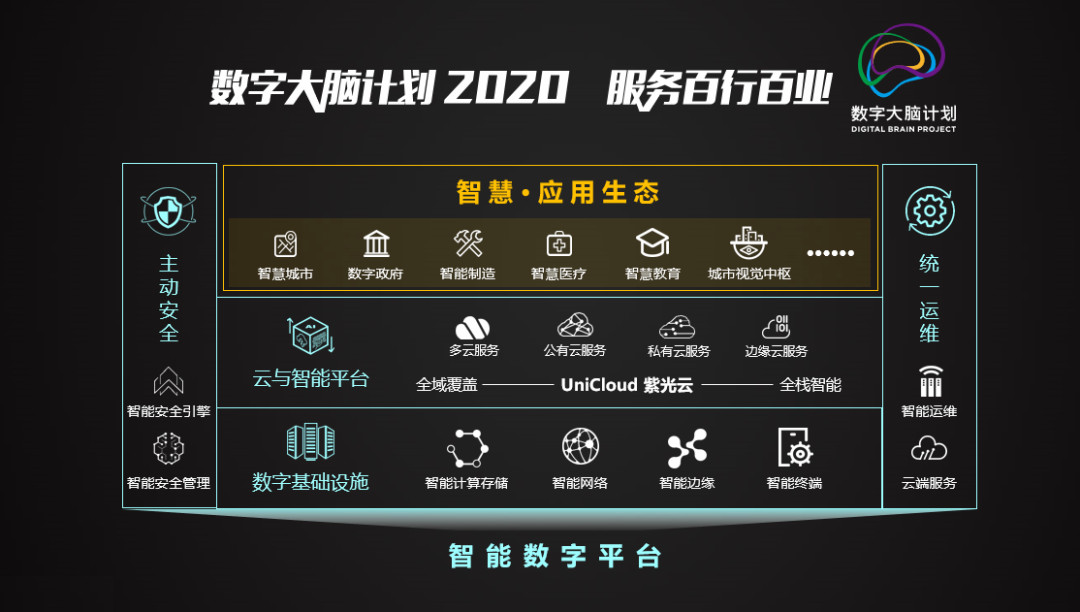 為(wei) 了與(yu) 客戶攜手更好地迎接“智變”時代,新華三隆重發布了全新的“AI in ALL”智能戰略,致力於(yu) 讓自身的產(chan) 品和解決(jue) 方案更具智能,同時助力客戶的業(ye) 務與(yu) 運營更智能。在智能戰略的引領下,新華三發布了全新升級的“數字大腦計劃2020”。2019年首次發布的數字大腦計劃,以數字基礎設施、業(ye) 務能力平台、主動安全和統一運維構成的智能數字平台為(wei) 基礎,與(yu) 生態合作夥(huo) 伴開展智慧應用領域的創新。在“數字大腦計劃2020”中,除了繼續將智能技術全麵應用於(yu) 數字基礎設施、主動安全及統一運維中之外,更將業(ye) 務能力平台全麵升級為(wei) 雲(yun) 與(yu) 智能平台。紫光集團成立了紫光雲(yun) 與(yu) 智能事業(ye) 群,將雲(yun) 與(yu) 數字化業(ye) 務提升為(wei) 集團核心戰略。整合私有雲(yun) 、公有雲(yun) 、人工智能、視頻雲(yun) 、軟件服務能力,實現技術、品牌、市場、服務全麵統一,以全新打造的“紫光雲(yun) ”品牌麵向市場,致力於(yu) 成為(wei) 智能時代百行百業(ye) 數字化轉型的最佳合夥(huo) 人。以新麵貌登場的“紫光雲(yun) “將提供公有雲(yun) 、私有雲(yun) 、邊緣雲(yun) 以及多雲(yun) 服務的全域覆蓋能力,滿足市場多元化的需求,同時把智能化技術全麵應用到數字中台、數據引擎、安全服務、視覺能力平台等,以全棧智能、全域覆蓋和全場景應用賦能百行百業(ye) 的數字化和智能化。