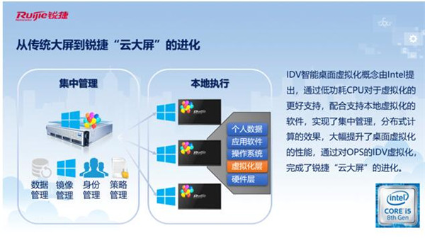 傳(chuan) 統大屏在實際應用中,缺少遠程運維管理,一旦出現設備損壞或者軟件更新,運維老師就要去一間間教室維護,費時費力。銳捷雲(yun) 大屏采用了IDV智能桌麵虛擬化架構,並通過自主研發的OPS平台進行集中管理,完成了從(cong) 傳(chuan) 統大屏到“雲(yun) 大屏”的升級。