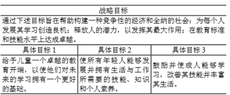在此之後,英國政府又於(yu) 2002年頒布了《傳(chuan) 遞結果:到2006年的戰略》,它全麵勾畫出英國國家教育改革發展的戰略目標(見表1)。