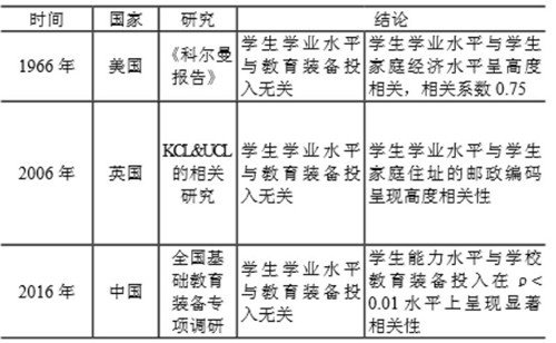 上述林林總總的配備標準是對構成學校教育教學環境、條件的標準化規定,所以它們(men) 具有明顯的條件取向的特征,於(yu) 是我們(men) 可以認為(wei) ,教育裝備配備標準是條件取向性的標準。而我國教育標準化則更多的是關(guan) 注這些條件取向的標準建設,對目標取向的標準問題研究和重視不夠。況且,教育裝備的配備對學生的學業(ye) 水平是否能夠發揮良性作用還是值得懷疑的,美國(American,簡稱A)1966年的《科爾曼報告》、英國(British,簡稱B)2006年KCL和UCL的相關(guan) 調研以及中國(China,簡稱C)2016年的全國基礎教育裝備調研(以下合並簡稱“ABC調研”)都顯示出:教育教學環境與(yu) 學生學業(ye) 水平不具有相關(guan) 性(詳見表2) [7]。對於(yu) 學生的學業(ye) 水平,規定條件性的工作繁雜而無效,規定目標性的工作倒有可能產(chan) 生好的效果,所以目標取向的標準化優(you) 於(yu) 條件取向的標準化在很大可能性下是成立的。
