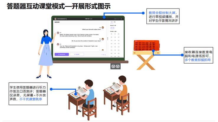 到課中環節,教師借助PC、平板、答題器等多種形式終端,針對學生展開看、聽、說綜合一體(ti) 的互動教學,有效提升課堂上的教學質量和教學效率。