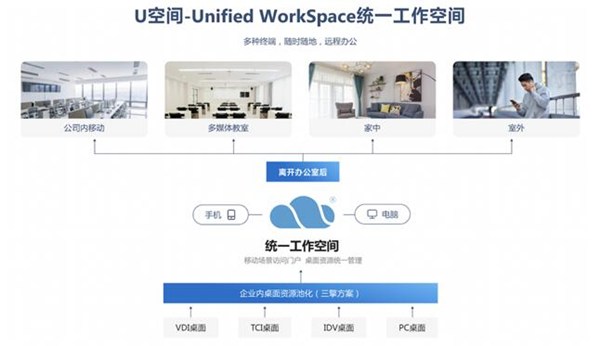VDI桌麵辦公方案具備數據不落地、隨處可訪問的特性,使其成為(wei) 安全+隨時隨地辦公的理想選擇。但實現VDI桌麵方案空間化對於(yu) 建設投入和維護都是一筆不小的數字,據測算,桌麵雲(yun) 建設中單桌麵成本超3000元,而要實現PC用戶數據遷移,以單用戶30G平均數據量、10多個(ge) 應用安裝量來計算則需要4小時以上的遷移時間。而U空間可支持VDI/IDV/TCI/PC任意桌麵類型,用戶僅(jin) 需軟件投入,無須遷移成本,極大地節省了設備、人力及時間成本。
