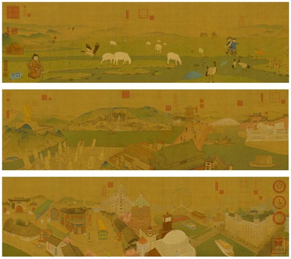鑒賞課的後半段,三地學生還同屏共繪了現代版《千裏江山圖》,若爾蓋的廣闊草原、河南曆史悠久的名勝古跡、天津海河兩(liang) 岸的幢幢高樓……三地的山川湖海與(yu) 人間煙火在“雲(yun) ”端交融,展現了一幅新時代下人與(yu) 自然、人與(yu) 文化曆史、人與(yu) 科技和諧共生的美麗(li) 圖景。