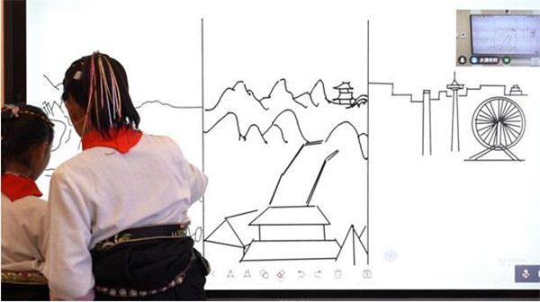 圖注:四川若爾蓋達紮寺小學的學生正在屏幕前繪製若爾蓋花湖