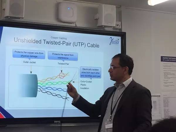 這是Logic Studio School(邏輯工作室學校)的一節“非屏蔽雙絞線網線製作”課,教師正在利用PPT講解雙絞線的構成及網線製作的要求,之後在教師指導下學生開始實際操作,目標是讓學生學會(hui) 剪線、剝線、解線、拉直、排列、剪齊、插線、壓線、測試等一係列操作。每一步操作都有明確的技術要求,這裏的圖片、視頻有效地配合了教師的講解,能更好地讓學生理解技術要領和操作規範,效果明顯。
