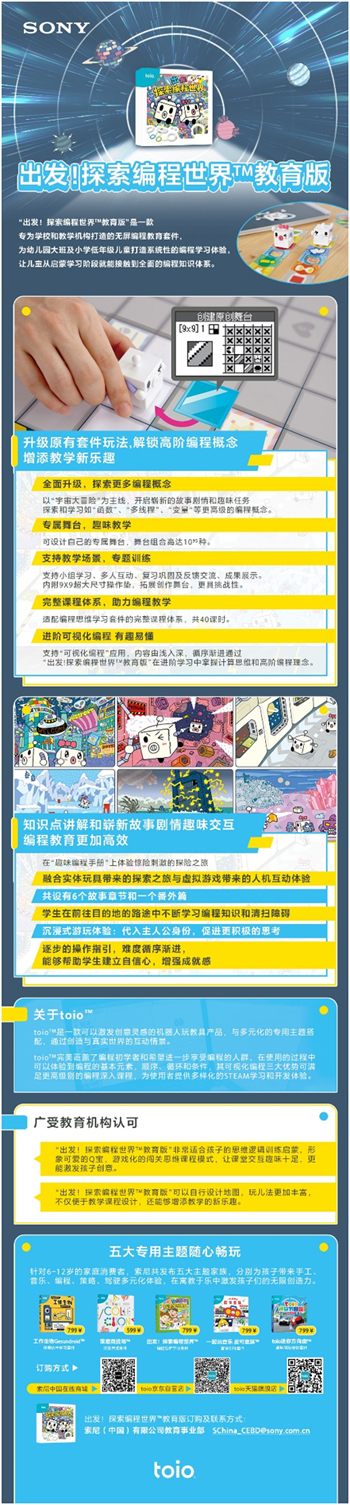 2023年7月13日,北京——索尼(中國)有限公司教育事業(ye) 部(下稱:索尼)正式推出專(zhuan) 為(wei) 幼兒(er) 園、小學及教育機構打造的無屏編程教育套件——“出發!探索編程世界™ 教育版”,並在發布會(hui) 上推出體(ti) 係化的、可覆蓋幼兒(er) 園至成人各年齡段的toio™教育教學解決(jue) 方案。新發布的教育版相較此前發布的基礎版,提升了知識內(nei) 容的深度和廣度,強化了舞台的原創性和拓展性,在配套課程中還融入了項目製學習(xi) 等內(nei) 容。此外,不同年齡段的用戶可以通過toio™提供的教育教學解決(jue) 方案進行STEAM及編程學習(xi) 。