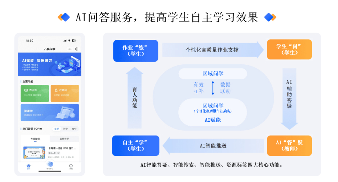 金華市武義(yi) 縣明招小學是一所擁有百年曆史的學校,大量外來務工子女在這裏接受教育。學生在日常作業(ye) 中,不可避免會(hui) 產(chan) 生大量疑問,但大多時候難以解決(jue) ,很多家長沒時間也沒能力輔導孩子。同時,學生周末或假期提問,老師逐一答疑負擔較重,也存在針對性不足等問題。在這樣的背景下,明招小學通過“八婺問學”平台開創性地將“學生問一老師答”的課後場景,拓展為(wei) “作業(ye) 練一學生問一老師答一學生學”的“課前 + 課中 + 課後”場景閉環。