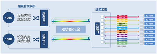 同時,以太彩光技術下的極簡光方案整體(ti) 采用了大二層架構,以無源透明匯聚替代原樓棟有源匯聚,真正實現了匯聚節點無源,弱電間零維護;而且通過波分技術和交換機融合,提升了核心端口密集程度和總接口數量,核心側(ce) 采用超融合模塊,單個(ge) 端口下聯一根光纖就可實現8個(ge) 入室交換機接入。將原來核心側(ce) 的8個(ge) 光口,替換成現有一個(ge) 超聚合模塊,大幅度降低了核心側(ce) 端口占用數、跳線數量,部署方式更加簡約,運維工作更加輕量。