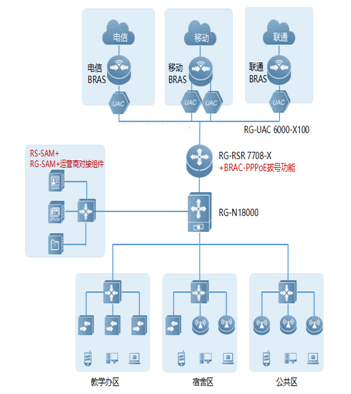 針對學校提出的具體(ti) 需求,銳捷網絡對原有網絡環境多次摸底,提出了以SAM+(認證計費管理平台)為(wei) 產(chan) 品核心的BRAC(Broadband Remote Access Concentrator,遠程接入集中器)智慧運營解決(jue) 方案,並部署銳捷RG-RSR77係列路由器、RG-UAC 6000統一上網行為(wei) 管理和審計係統、RG-N18000係列交換機。