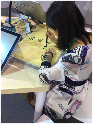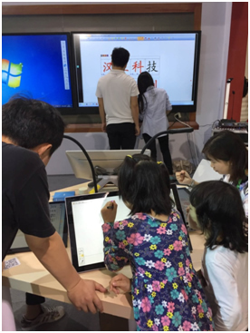 漢王數字化書(shu) 法繪畫課堂解決(jue) 了這個(ge) 難題。展會(hui) 現場,模擬出一個(ge) 現代化書(shu) 法繪畫教室:講台上,兩(liang) 台75寸電磁紅外雙觸控一體(ti) 機代替了傳(chuan) 統黑板,書(shu) 法教師正在用互動軟件為(wei) 觀眾(zhong) 講授書(shu) 法課程。