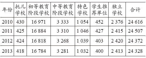 表1 2010-2013年英國基礎教育階段學校數量統計情況 單位:所