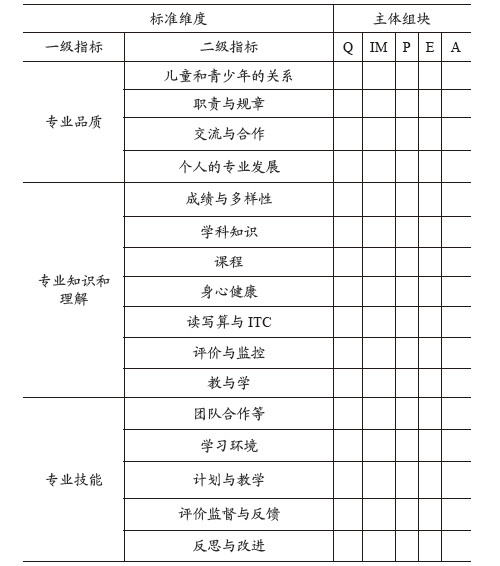 (1)專(zhuan) 業(ye) 品質。規定了與(yu) 兒(er) 童和青少年的關(guan) 係、職責與(yu) 規章、交流與(yu) 合作、個(ge) 人的專(zhuan) 業(ye) 發展共4個(ge) 二級指標。