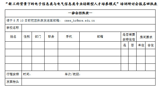 附件:新工科背景下的電子信息類與(yu) 電氣信息類專(zhuan) 業(ye) 創新型人才培養(yang) 模式研討會(hui) 報名回執表