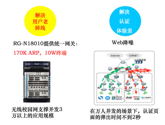 RG-N18010係列交換機不但是無線網的核心,同時可以把所有有線用戶的網關(guan) 上收,並啟用集中式的Portal認證,結合web降噪、無感知認證、跨廠商無縫漫遊等技術,頁麵彈出時間為(wei) 毫秒級別,給全校師生帶來超爽的網絡使用體(ti) 驗。