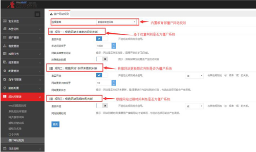 針對此標準,烽火台治理平台通過智能算法,結合大數據相關(guan) 進行自動化僵屍網站梳理,自動的完成網站資產(chan) 普查與(yu) 安全合規檢測。我們(men) 隻需配置一步即可完成僵屍係統識別。