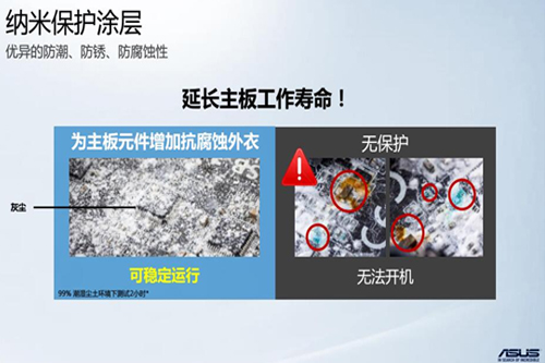 此外,華碩行業(ye) 專(zhuan) 供CSM主板並采用黑科技納米保護塗層,可有效防潮、防鏽、防腐蝕,極大延長了主板工作壽命;擁有五重防護,包含增強型ESD靜電防護、防電湧、過壓保護、穩定供電、過流防護和不鏽鋼防潮I/O接口,提供硬件級安全防護,多方位防護保證主板的質量與(yu) 長期耐用性;此外,在溫度高達 45°C、濕度高達 80% 的條件下,經過嚴(yan) 苛的168小時7×24壓力測試,確保主板在高溫高濕環境下也能穩定運行。