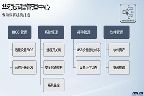 華碩根據教育用戶的需求,從(cong) 應用場景化角度考慮,通過內(nei) 置高效統一化管理的華碩遠程管理中心軟件(ACC–ASUS Control Center),對主板產(chan) 品的功能進一步“加持”。ACC搭配CSM主板應用,可從(cong) 增強集控性能、降低操作難度、提升可視化特色等多方麵,彌補學校相關(guan) IT運營管理人員在專(zhuan) 業(ye) 能力和精力投入方麵的不足。通過ACC,學校可輕鬆高效統一管理多台主機,大幅度提高IT管理效率。具體(ti) 來說,ACC在Bioses管理、係統管理、硬件管理、軟件管理等方麵大有作為(wei) 。在Bioses管理方麵,ACC的應用可實現遠程設置、升級Bioses,且所有CSM主板均支持定製專(zhuan) 屬的Bioses,如專(zhuan) 屬開機Logo畫麵、專(zhuan) 屬客製化固件信息等。而係統管理包括了遠程開關(guan) 機、安全啟動控製、係統監控。硬件管理包括了USB設備啟動狀態管理、設備運行狀態管理。軟件管理包括了軟件資產(chan) 管理以及安裝推送管理。