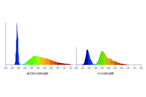 投影機產(chan) 品僅(jin) 擁有更廣的色域範圍還不夠,還應該實現色彩的精準還原,這樣才能夠讓豐(feng) 富的色彩發揮真正的效果。通過HLD光源與(yu) 傳(chuan) 統固態光源的光譜圖像波段對比不難看出,HLD光譜中的藍光比例更低,擁有更加趨於(yu) 連續的光譜波段,顯色性更好,對顏色真實還原度更高,即使是複雜的教學課件也能精準展現。