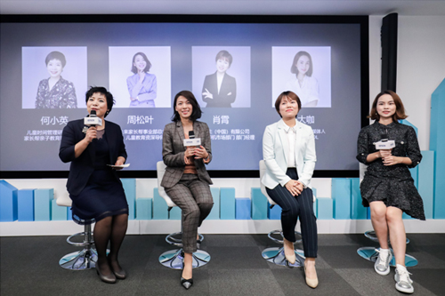 從(cong) 左至右:兒(er) 童時間管理研究專(zhuan) 家、家長幫親(qin) 子教育明星講師何小英,學而思資深導師、好未來家長幫事業(ye) 部總負責人周鬆葉,愛普生(中國)有限公司打印機市場高級經理肖霄,明星家長陳大咖