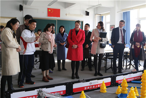 BESA一行首先走進了區級重點中學——首都師範大學附屬密雲(yun) 中學,在學校領導的引領下參觀了學校的閱讀教室、組培實驗室、微生物實驗室、創客活動教室、機器人社團活動空間以及生物實驗基地等,學生代表用流利的英文向來賓進行了細致的介紹。