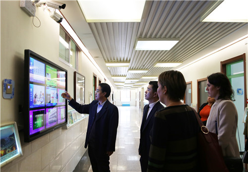 校長向來賓展示學校教學樓樓道中的觸控大屏